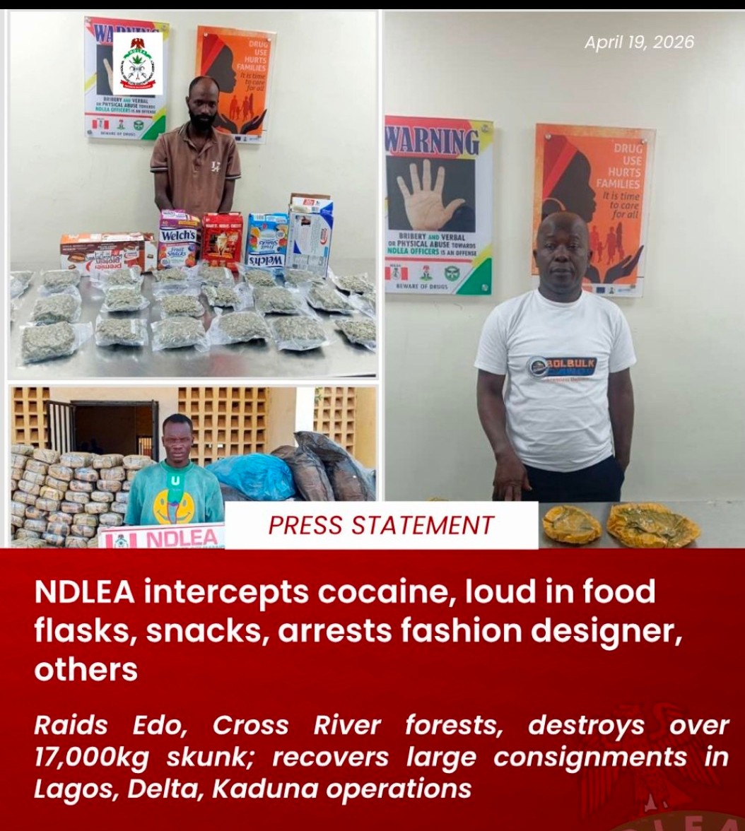 National Drug Law Enforcement Agency (NDLEA) operatives have intercepted cocaine and Loud cannabis hidden in food flasks and snack packs at Lagos’ Murtala Muhammed International Airport (MMIA)arresting a fashion designer and several cargo agents.