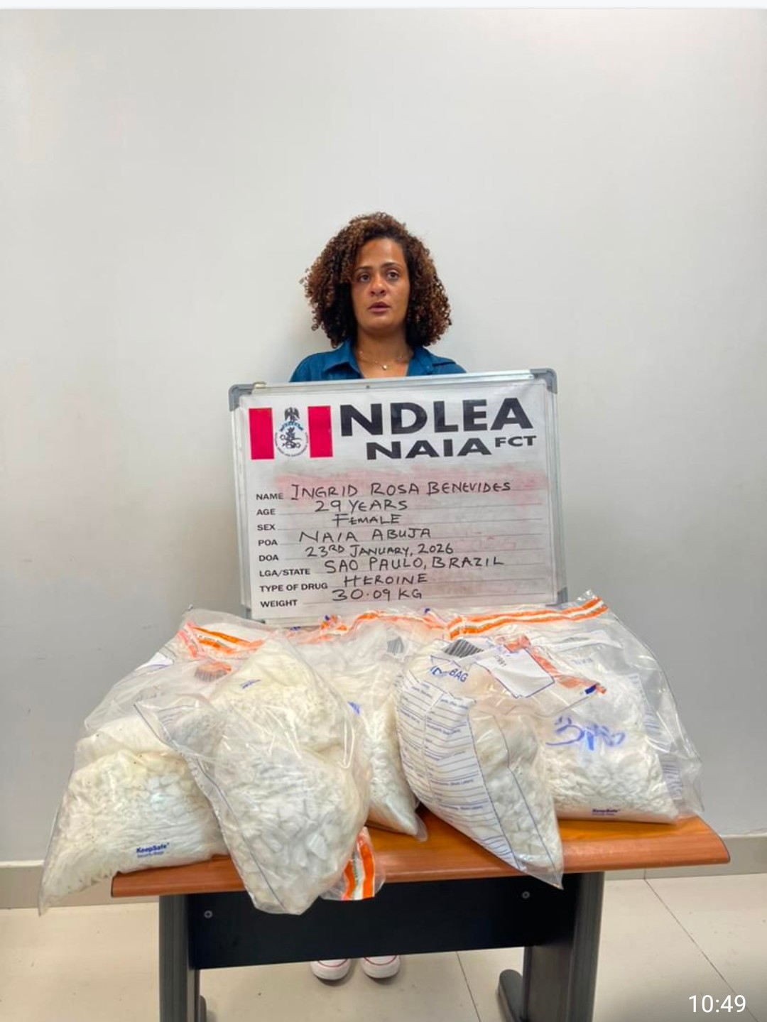 National Drug Law Enforcement Agency (NDLEA) has arrested a 30-year-old Brazilian lady, Ingrid Rosa Benevides at Abuja airport with Nigeria’s largest heroin seizure: of 30.09kg worth over N3 billion in street value. hidden in coffee packs on a Qatar flight.